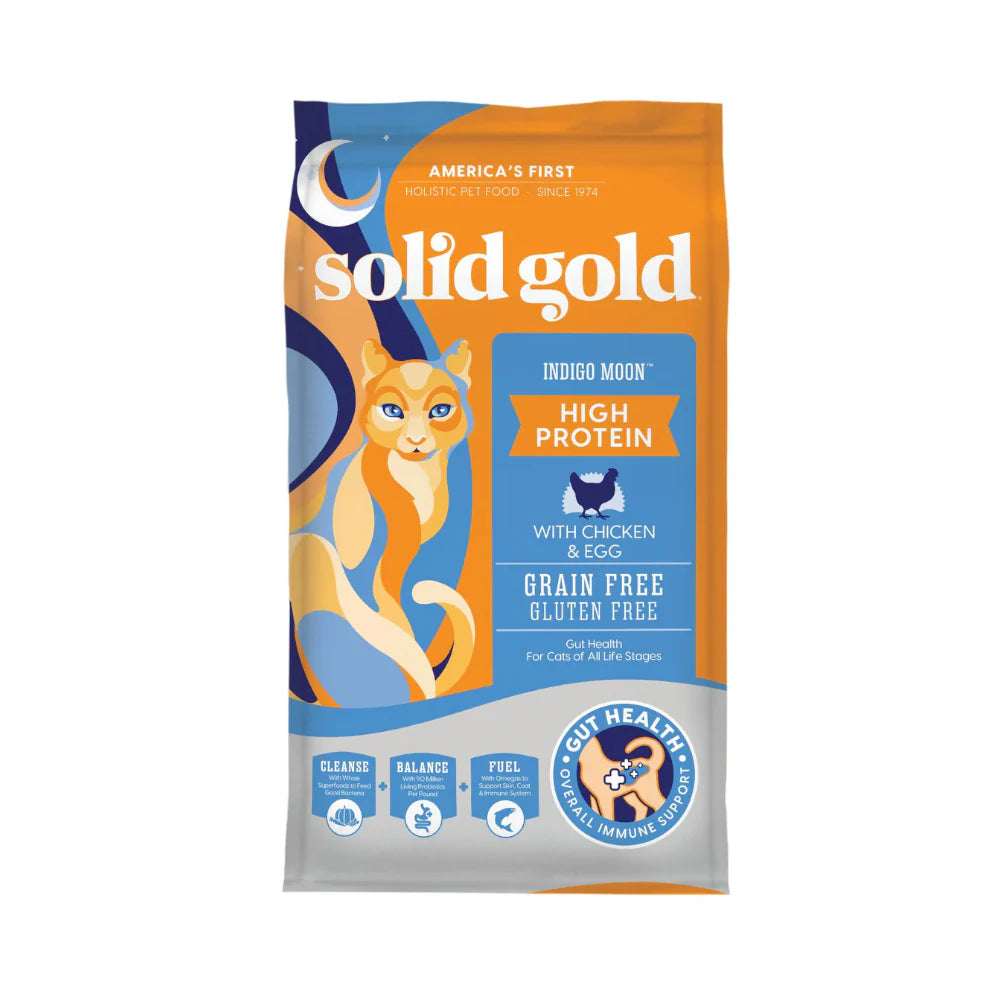 سوليد جولد إنديجو مون طعام جاف للقطط البالغة خال من الحبوب والجلوتين بنكهة الدجاج والبيض غني بالبروتين وخالي من الحبوب، ويحتوي على دجاج طبيعي من مصادر مستدامة وبيض كامل مليء بالعناصر الغذائية، بالإضافة إلى مزيج فريد من السوبرفودز لدعم صحة الجهاز الهضمي والمناعة.