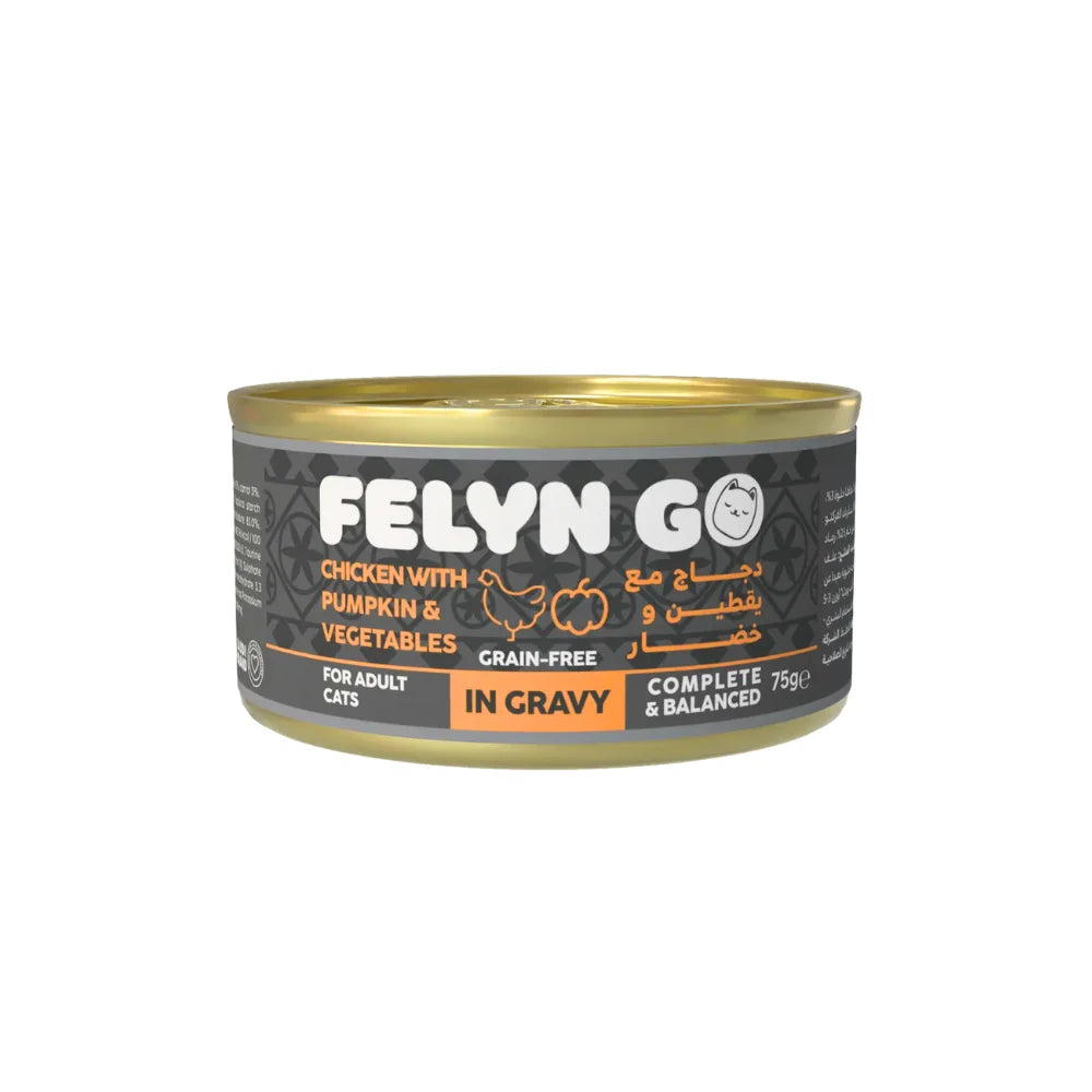 دللي قطتك وأضيفي لمسة من التنوع والتغذية الصحية إلى وجبتها اليومية مع فيلين جو كانز دجاج مع اليقطين والخضروات في المرق - 75 جم ! هذا الطعام الرطب المميز مصمم خصيصًا لتلبية احتياجات القطط اليومية، مما يجعله الحل الأمثل لتقديم وجبة متوازنة ولذيذة لمحبوبتك.