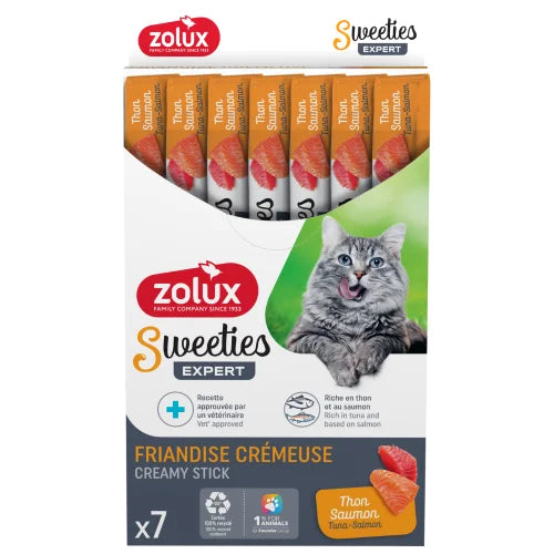 تتميز زولوكس سويتيز بمكوناتها عالية الجودة وقوامها الكريمي السلس الذي يعشقه القطط من جميع الأعمار. خالية من المواد الحافظة الصناعية والملونات، ومُعدّة بلطف لتكون لطيفة على جهازها الهضمي الحساس. العبوة تحتوي على 7 أنابيب بوزن 14 جم لكل منها، مما يوفر لكِ حلًا عمليًا ونظيفًا للتقديم اليومي – سواء في المنزل أو أثناء السفر!