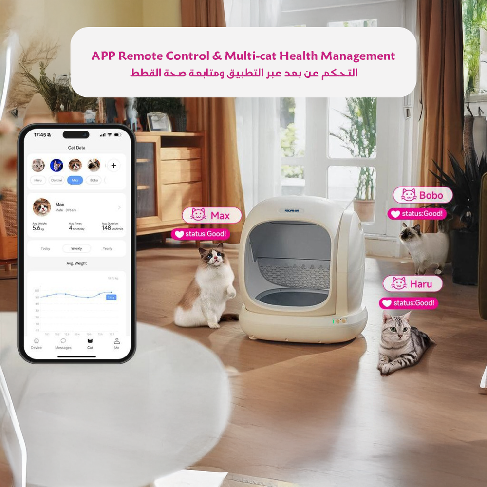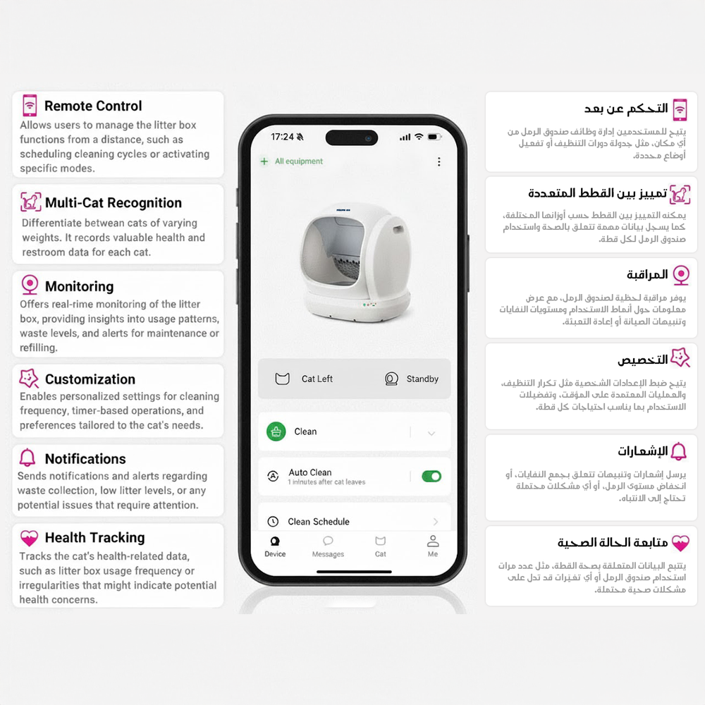 بفضل اتصاله بالتطبيق الذكي، يمكنك مراقبة عادات قطّك، ضبط جدول التنظيف، وحتى تسخين الصندوق في فصل الشتاء لضمان راحته القصوى. كل ذلك في تصميم أنيق يناسب كل بيت عصري.