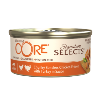 دللي قطتك وأضيفي لمسة من التنوع والنكهة الغنية إلى وجبتها اليومية مع ويلنس كور سيجناتشر سيلكتس قطع دجاج وديك رومي في صوص - 79 جم ! هذا الطعام الرطب المميز مصمم خصيصًا لتلبية احتياجات القطط اليومية، مما يجعله الحل الأمثل لتقديم وجبة شهية ومتكاملة لمحبوبتك.