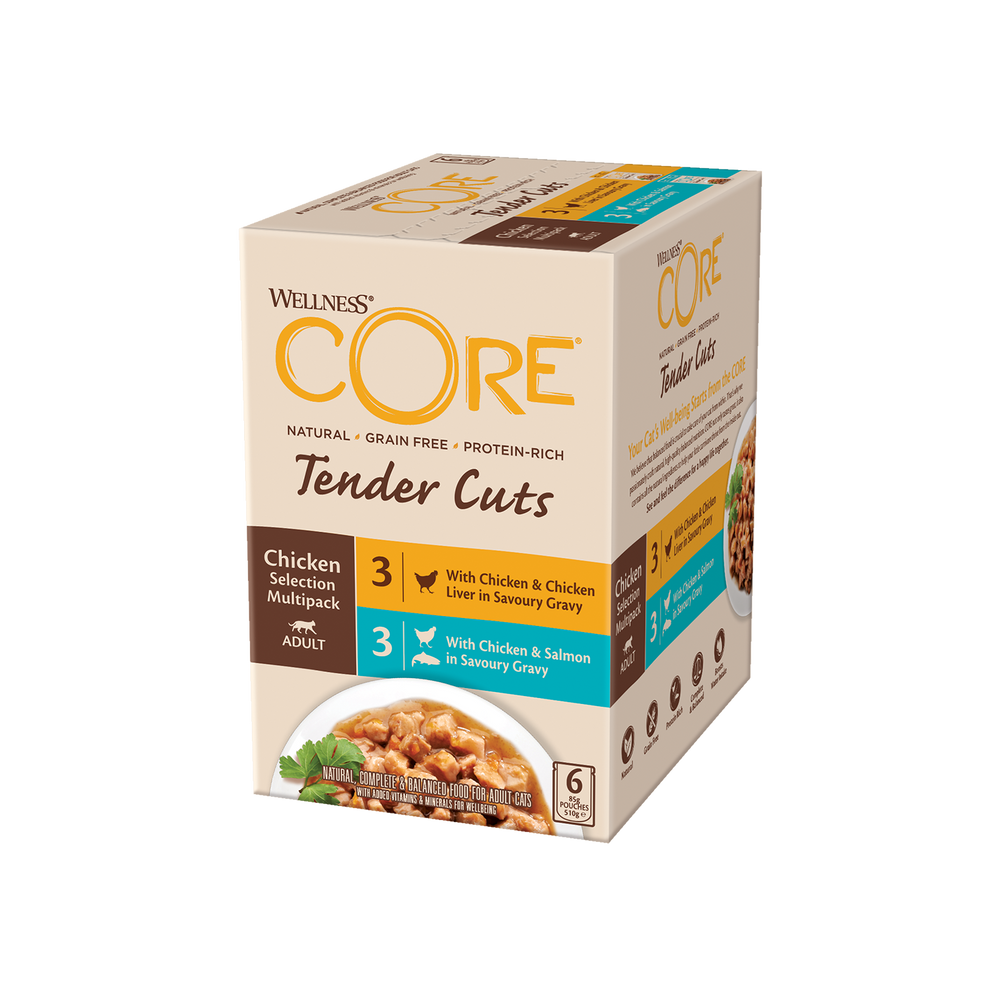 ويلنس كور مولتي باك أكياس دجاج وكبد الدجاج ×3 ودجاج وسمك السلمون ×3 في المرق للقطط 6×85 جم