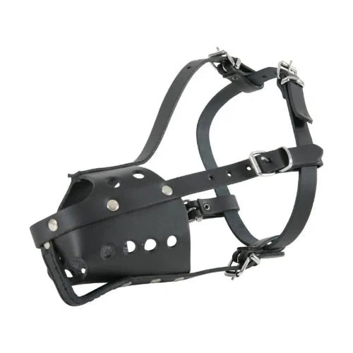 كمامة مصنوعة من الجلد عالي الجودة تحتوي على فتحة جيدة التهوية مع ابزيم لتضيق وتوسعة الكمامة لتناسب حجم رأس الكلب
